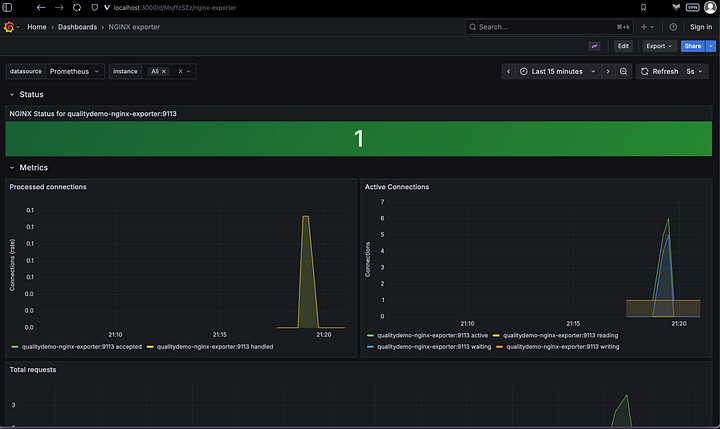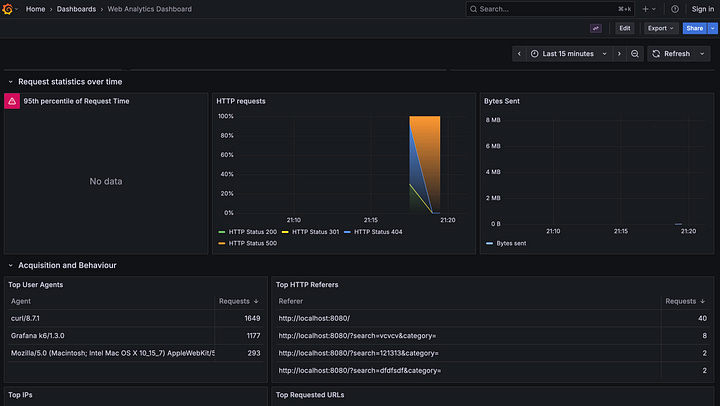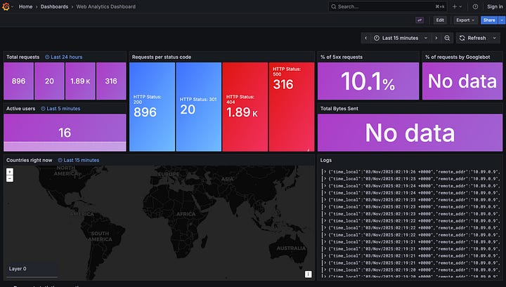 En clases, el taller considero que fue bien, todo funcionó y los alumnos pudieron ver como funciona en sus entornos locales. Hubo algunas dudas muy buenas sobre las tecnologías y cómo se comunican, que sirvieron para explicar múltiples conceptos sobre la arquitectura escogida (particularmente una sobre por qué obtenemos los logs de nginx y no sobre la capa de aplicación). Pero, me quedó algo pendiente: sentía que los gráficos están muy vacíos, no había mucha data. En este punto toca preguntarme, como hago para que pueda haber más data sobre la cual explorar.